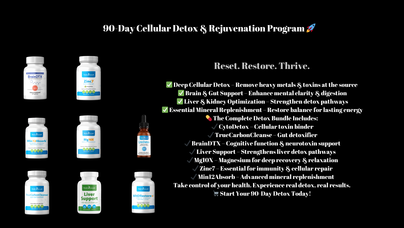 💊 Your Detox Bundle Includes: CytoDetox, TrueCarbonCleanse, BrainDTX, Liver Support, Mg10X, Zinc7, and Min12Absorb—everything you need for a full reset!