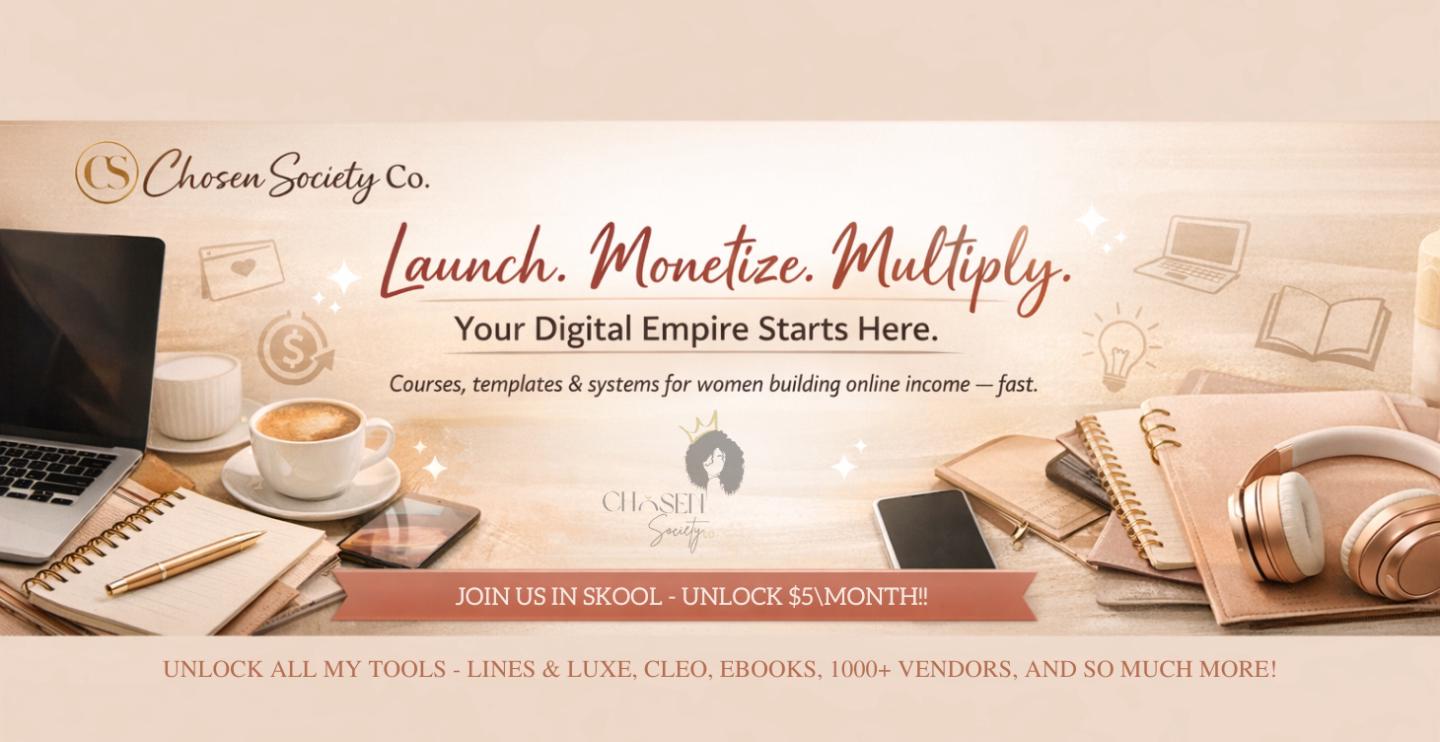 Welcome to Chosen Society Co.Your digital business HQ with all the tools, templates, and training you need to launch, sell, and scale online.