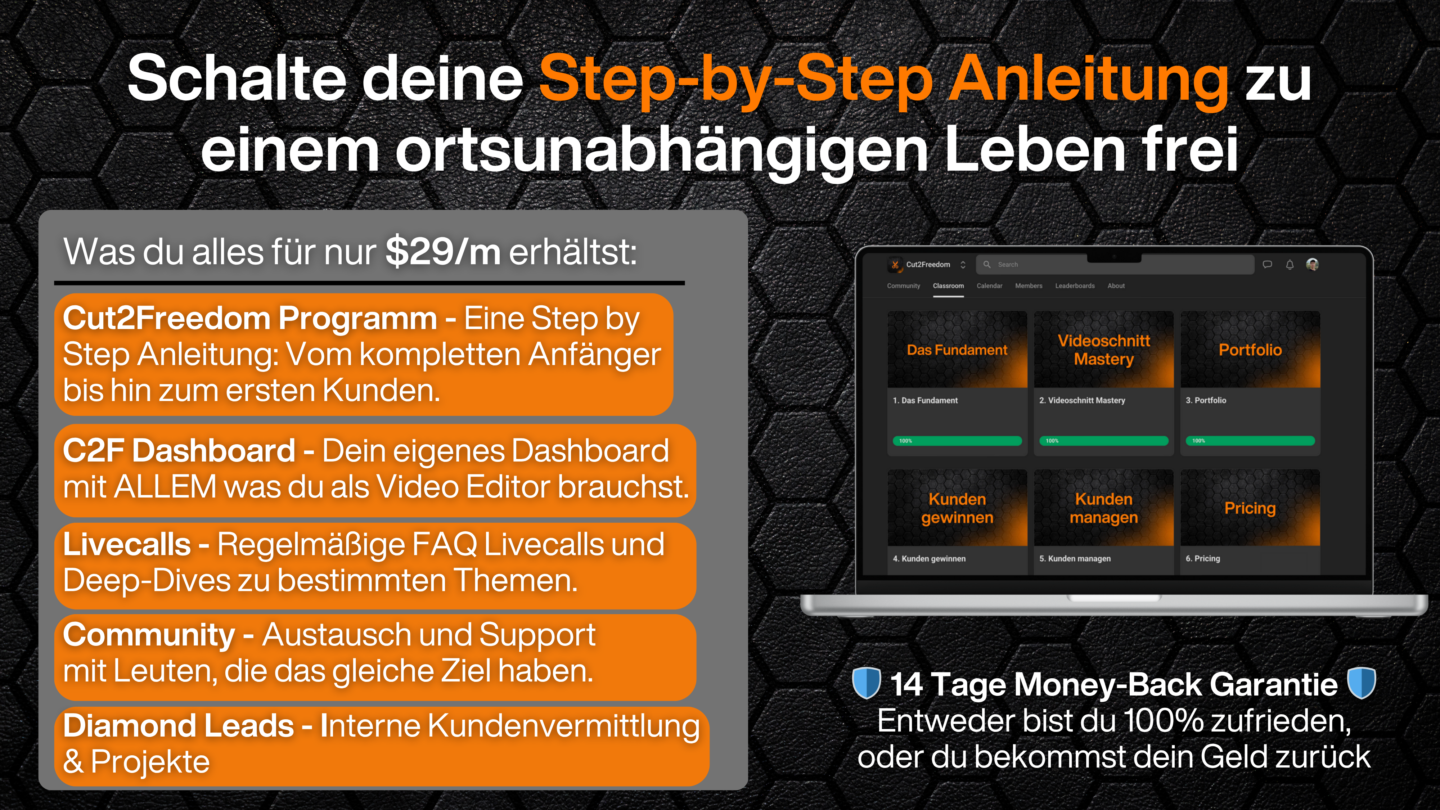 Lerne, wie du mit Videoschnitt in 90 Tagen deine ersten 1.000€ online verdienst und dir echte Freiheit aufbaust - auch wenn du bisher noch nie ein Video geschnitten hast!