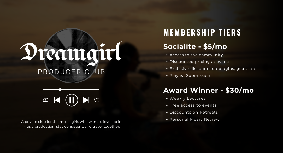 Welcome to the DreamGirl Producer Club! A private club for the music girlies who want to level up their music production, get connected, and travel the world.