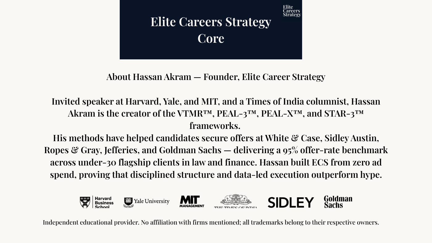 Every drill, clinic, and replay is anchored in the same frameworks used across our 95% offer-rate benchmark for under-30 flagship clients in law and finance.