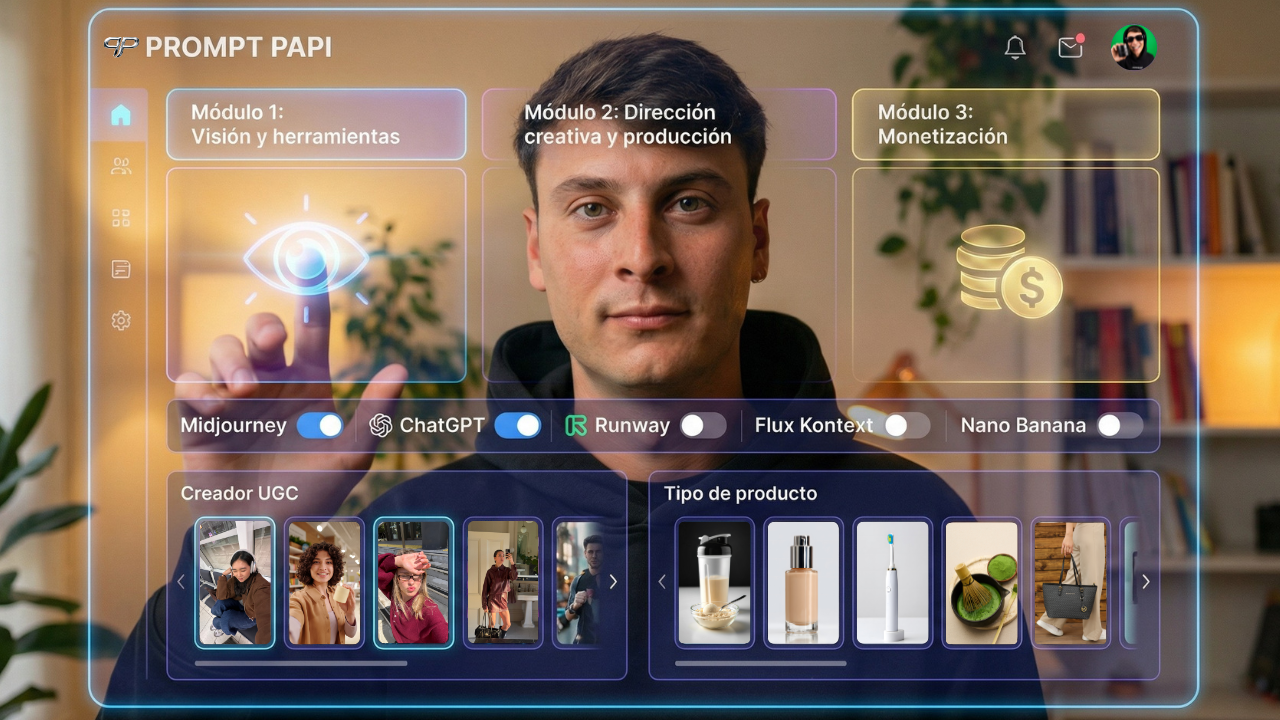 Aquí aprendes a pensar como un director creativo de IA, a crear visuales consistentes y profesionales, y a construir un portfolio que justifique proyectos de +10.000€.