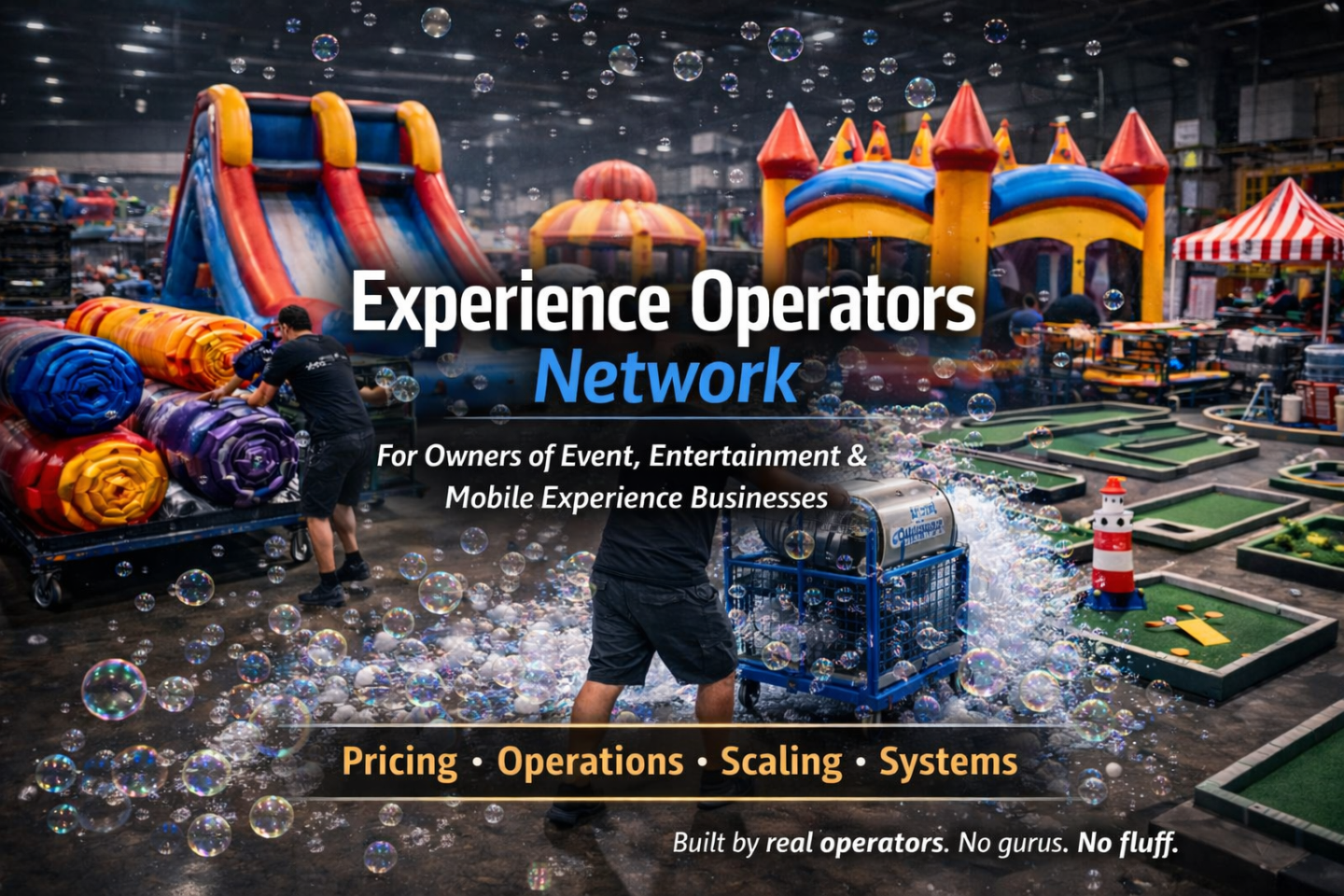 This is a private community for owners of experience-based businesses — event rentals, foam & bubble companies, inflatables, mobile games, mini golf, carnival concepts, and other live event experiences.
