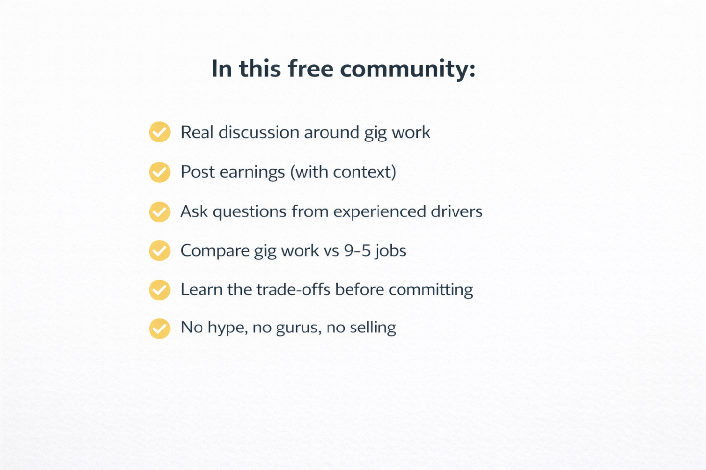 You’ll find grounded discussion around gig work, contextual earnings posts, and questions answered by people actually doing the work. The focus is on clarity and decision-making: when gig work helps, when it doesn’t, and what it realistically costs in time, money, and energy.