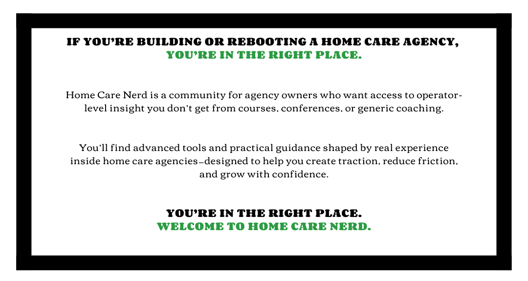 Home Care Nerd is a working community for agency owners who want clarity instead of chaos — a place to think, test, and build without doing it alone. This isn’t a course library you consume and forget. It's a shared journey.