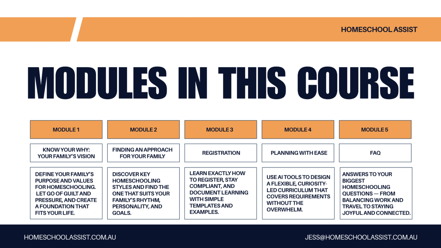 The Homeschool Starter Course by Jessica Popplestone is a calm, confidence-building guide designed to help parents begin their homeschooling journey with clarity and ease. Drawing on Jessica’s background as a teacher and founder of Homeschool Assist Australia, the course walks families through five key stages — defining their purpose and vision, discovering the teaching style that suits them best, navigating registration and learning plans, using AI to simplify planning, and overcoming common challenges such as time management, work balance, and assessment. Blending practical templates, personal insight, and gentle encouragement, the course helps parents see that homeschooling isn’t just possible — it can be the most rewarding and empowering choice for their family.