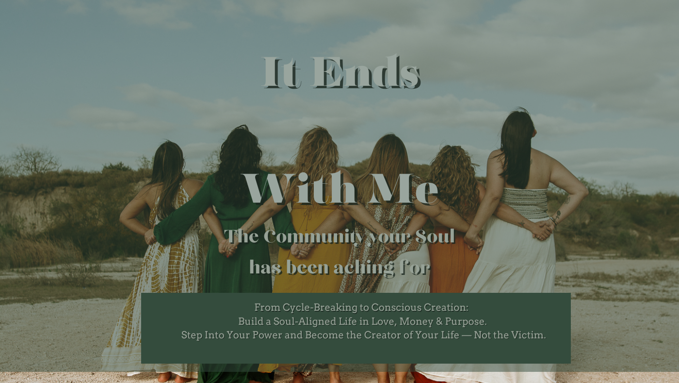 It Ends with Me is your full cycle breaker journey to heal from the past and to consciously create your future, aligned with your heart & soul. Taking back your power over ancestral trauma to rocket fuel you into your most expansive life. In Love & relationships , Money, Abundance and Soul Led Purpose ... literally whatever you want to create.