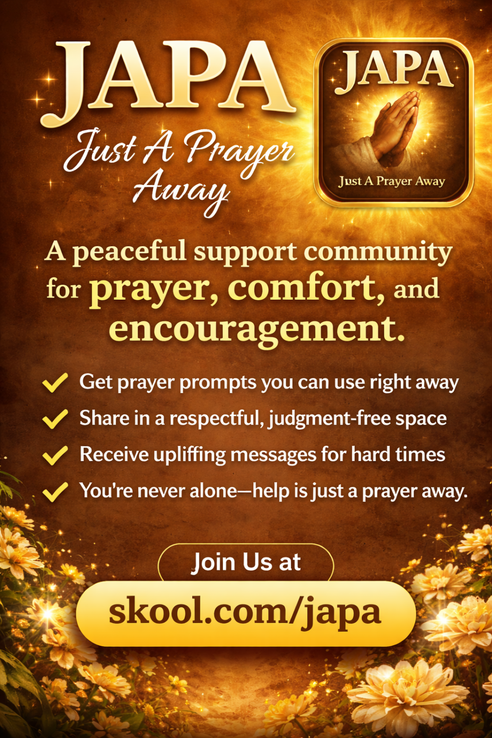 JAPA is a peaceful support community for anyone seeking prayer, comfort, and encouragement. A safe place to pause, breathe, and be supported.