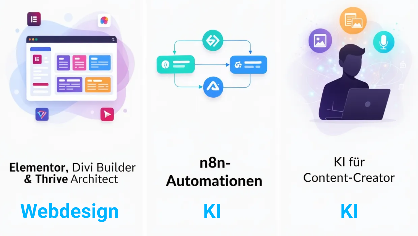 Hier lernst du WordPress-Webdesign mit 3 Pagebuildern (Elementor, Divi, Thrive Architect) und KI-Content-Creation für deine Inhalte, damit du entscheiden kannst welcher der Richtige für dich ist!