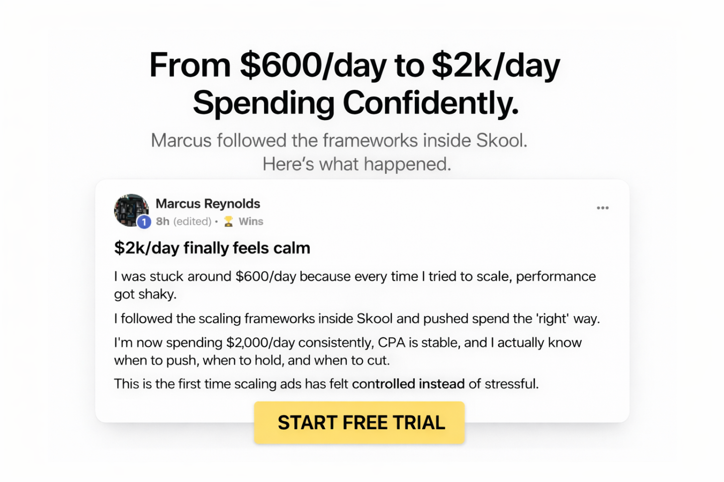 This Skool is for people who want to confidently spend $10k → $50k → $100k+ per month on ads without guessing or blowing accounts up.