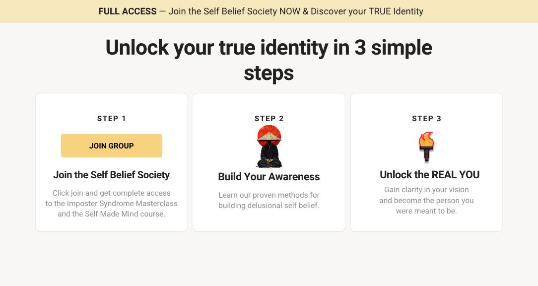 Join the Self Belief Society and learn how to build delusional self as an entrepreneur. Get the proven step by step system to unlock your true identity and stop playing a character. Learn how to embrace failure, build confidence and gain clarity in as little as 30 days.