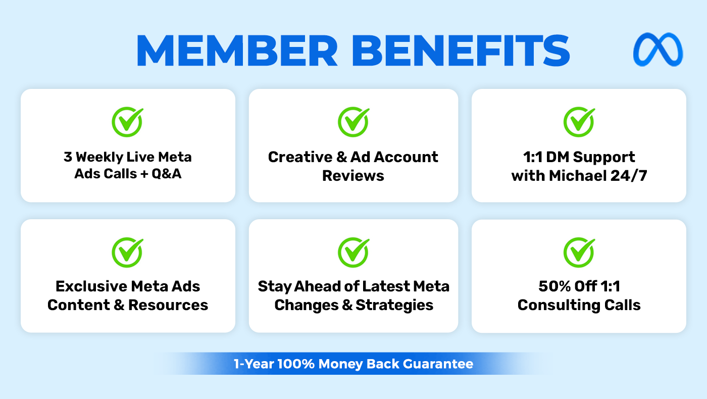 Improve your Meta Ads skills in 30-days & get all of your toughest questions answered in <24hrs.