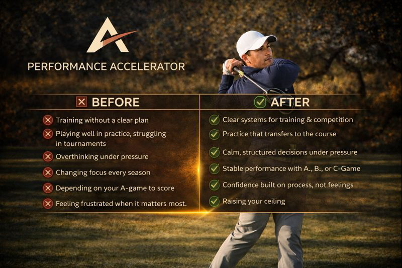 I help serious competitive golfers from single-digit handicap amateurs to young professionals who feel stuck or inconsistent; build a clear Tour-level system for how to think, train, and compete.