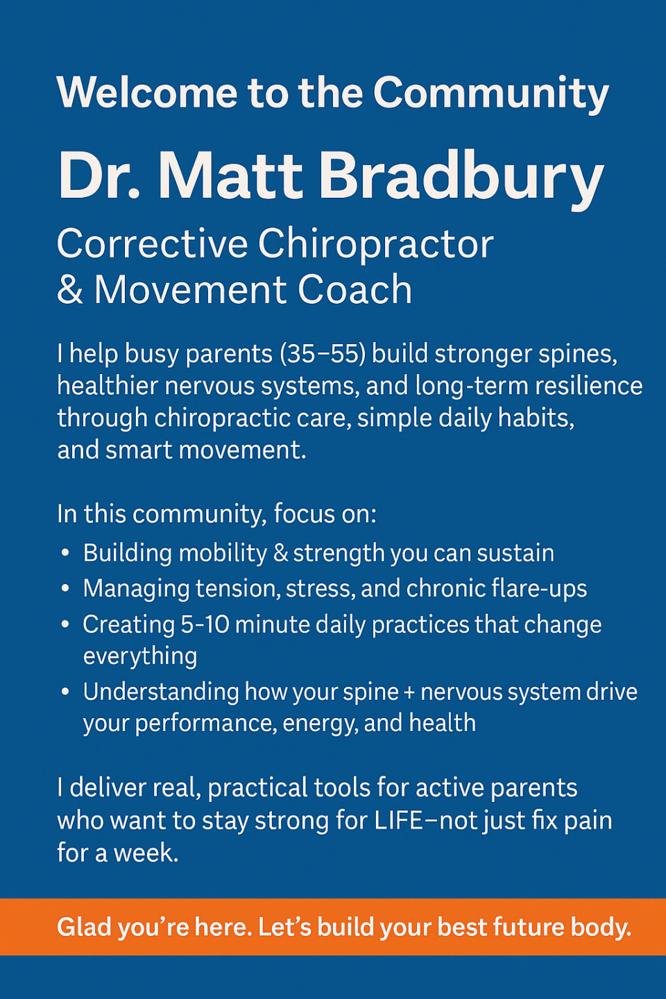 I help busy parents (35–55) build stronger spines, healthier nervous systems, and long-term resilience through corrective Chiropractic care, simple daily habits, and smart movement.