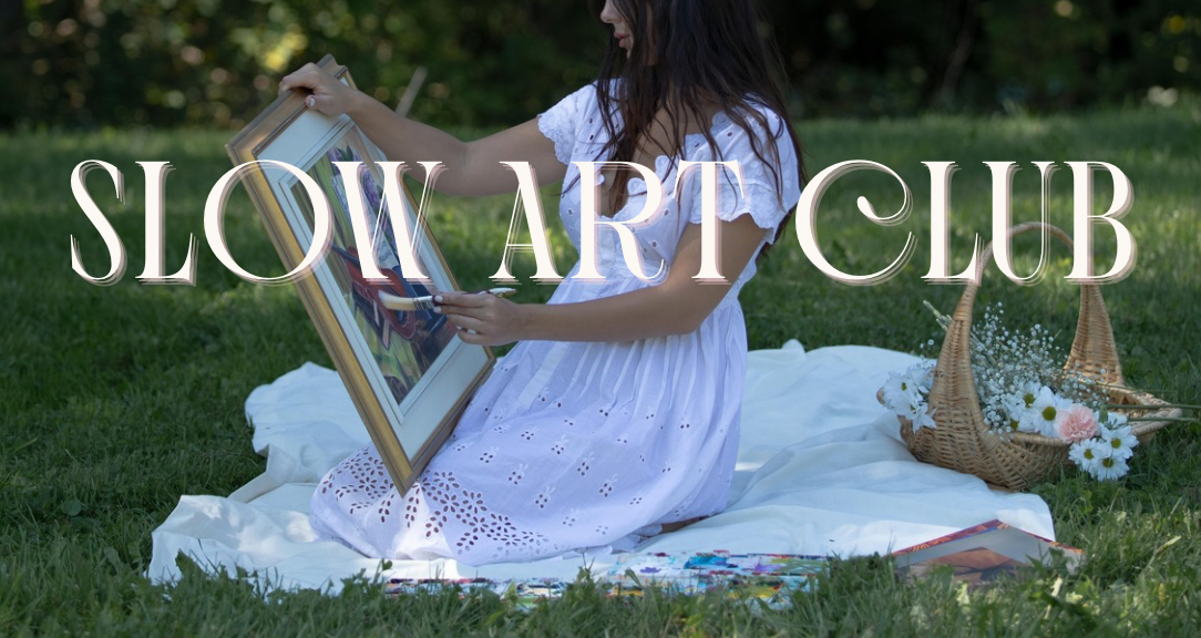 Slow Art Club: a free monthly online hangout for creatives. Monthly creative prompt + a full month to dive deep, explore, and play, together.