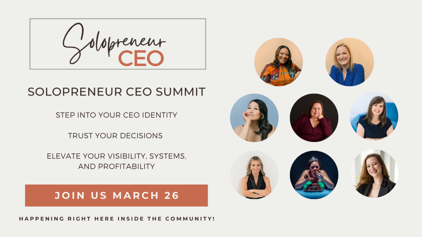 The Solopreneur CEO community is a free space for experienced, service-based solopreneurs who want a business that works without constant effort, stress, or overwork.