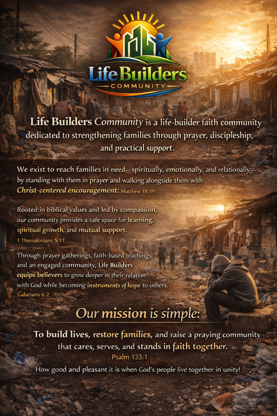 To build lives, restore families, and raise a praying community that cares, serves, and stands in faith together.