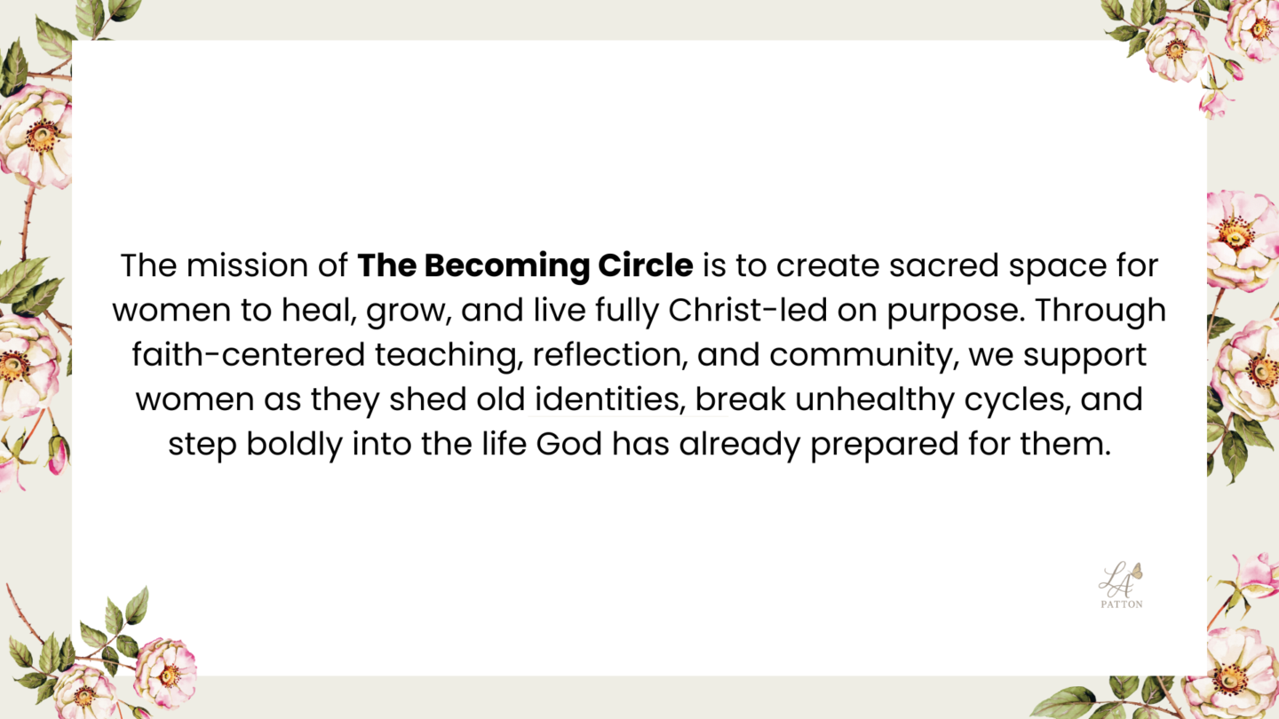 The Becoming Circle is a Christ-led community for women ready to heal, grow, and live with intention and purpose. This space offers faith-centered teaching, reflection, and support designed to help women shed old identities, break unhealthy cycles, and step into who God created them to be.