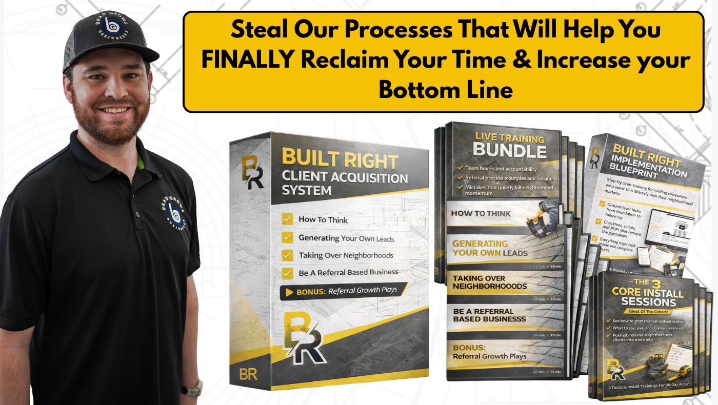 BuiltRightScaling.com helps owners install proven systems that turn every roof into 3 more, create consistent Roof-a-Day production, and scale like the top 7- and 8-figure roofers — without agencies or chaos. Inside our free Skool group (600+ roofers), you’ll get: