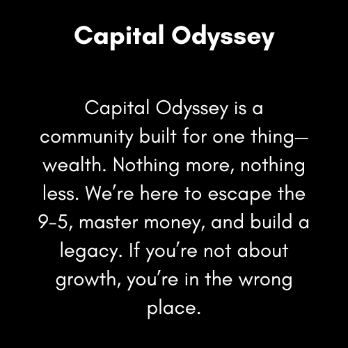 Welcome to Capital Odyssey, where young, ambitious people embark on the ultimate journey to financial mastery. This community is your launchpad for learning, exploring, and conquering the worlds of forex, stocks, and cryptocurrency.