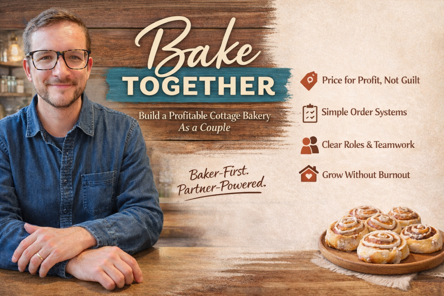 Bake Together is a practical course for cottage bakers who want a calm, profitable business; and for the partner who helps make that possible. This isn’t about new recipes or hustling harder. It’s about building simple systems, fair pricing, and clear roles so your bakery supports your family instead of running it.