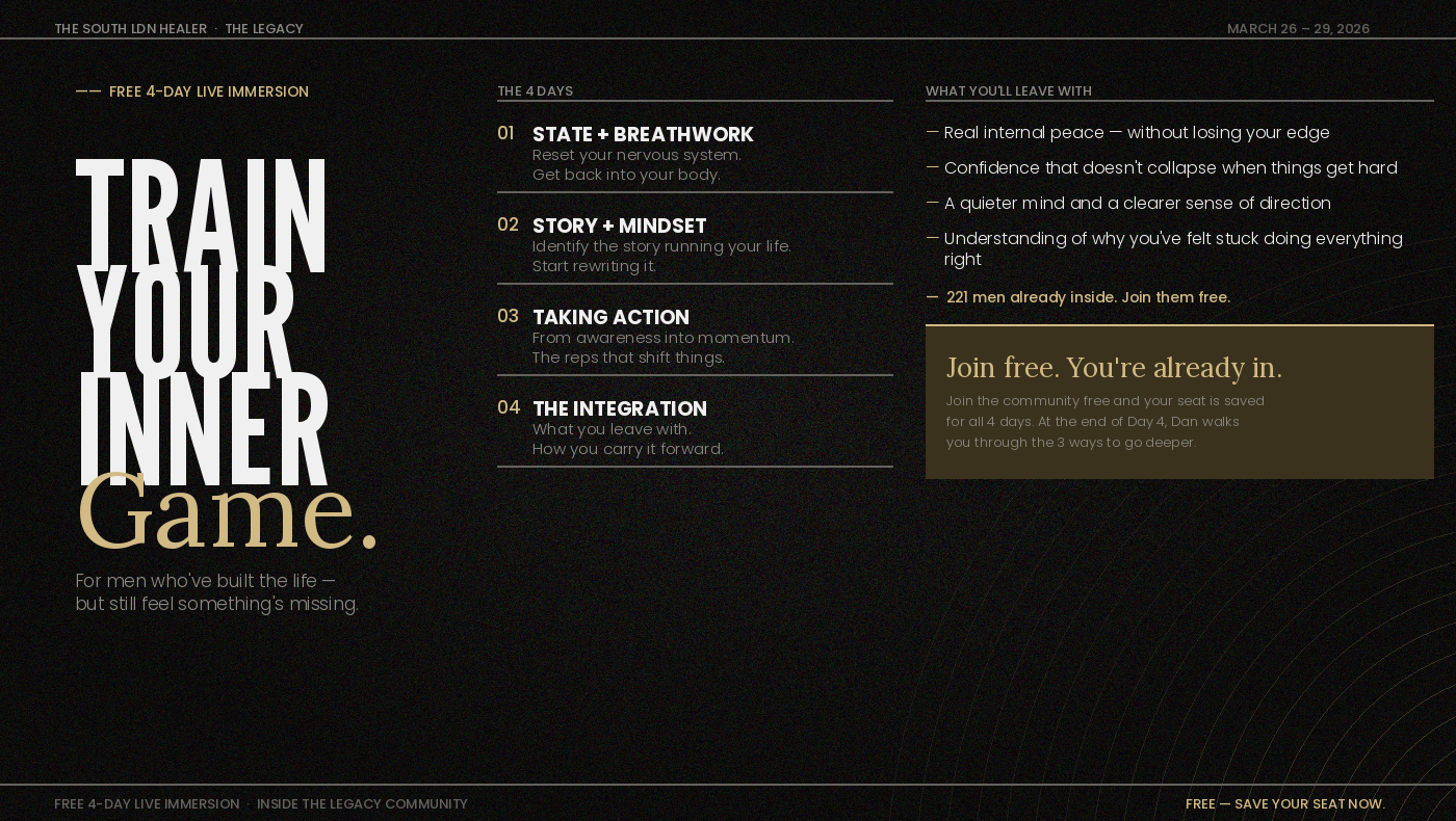 TRAIN YOUR INNER GAME is a free 4-day live immersion inside The Legacy for men whose heads feel double busy and who've worked their socks off but still feel off.