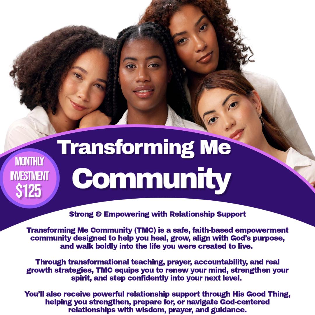 Transforming Me Community for women-only to renew your mind, heal, and walk boldly in your God-given purpose. Live teachings every Tue @ 7 pm EST.