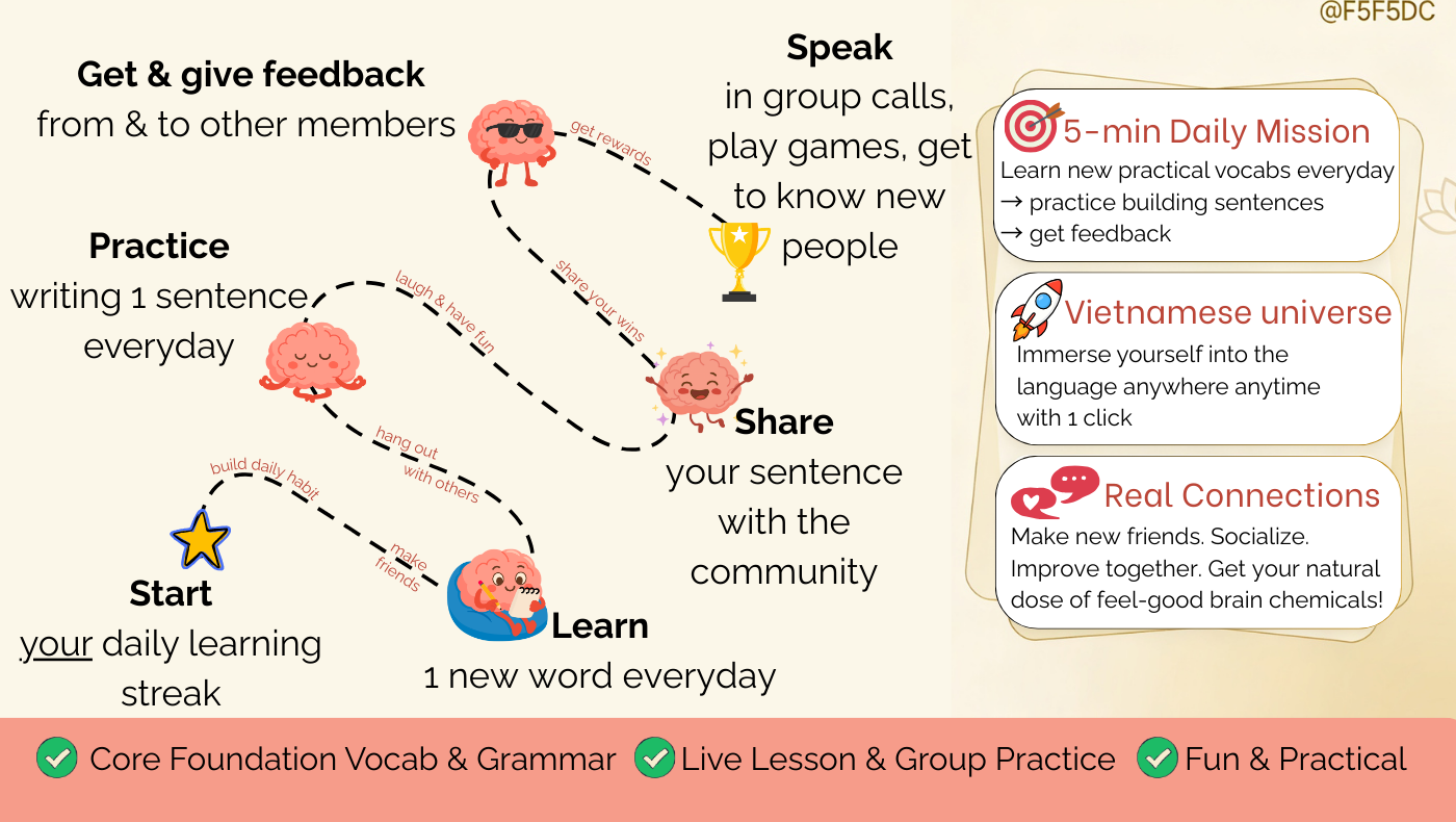 Dạ alo 🥳 I'm building this community as an extra tool to make it easiest possible for you to have daily exposure to Vietnamese. A little Vietnamese universe you can access anytime anywhere. A SAFE place to make MISTAKES, LEARN, and HAVE FUN* so no need to be shy!