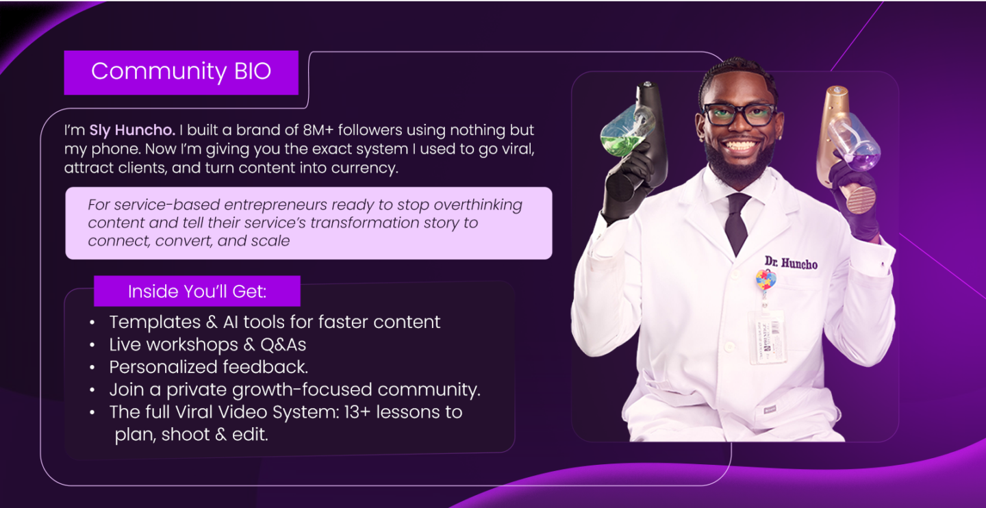 For just $97, this community gives service-based entrepreneurs the exact systems, tools, and guidance you need to stop overthinking content, go viral, attract clients, and turn your expertise into currency. Learn how to tell the story of your service’s transformation in a way that connects, converts, and scales your business