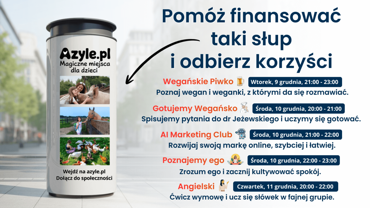 Treningi z weganizmu, aktywizmu, kuchni roślinnej, online marketingu i angielskiego. Rejestrując się, dorzucasz się do utrzymania słupa dla zwierząt.
